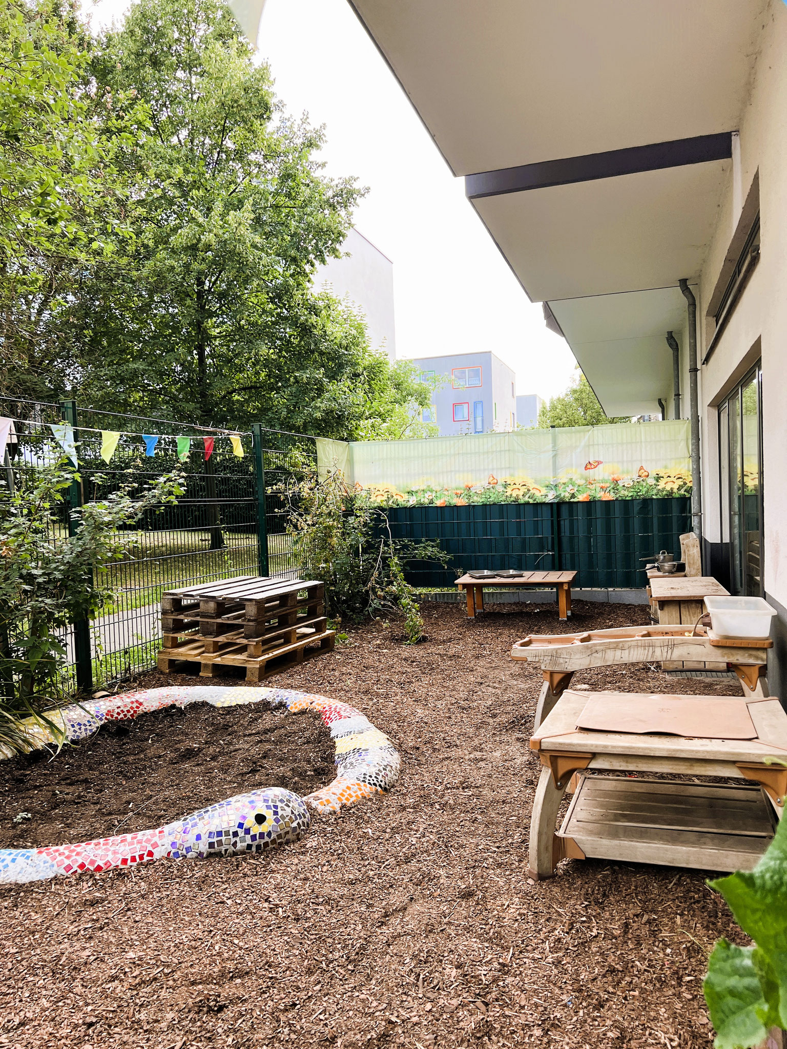 Als naturverbundene Kita mit dem Interesse, diese Verbundenheit und Wertschätzung auch den Kindern näher zu bringen, haben wir einen eigenen, etwa 180 qm großen Gartenbereich.