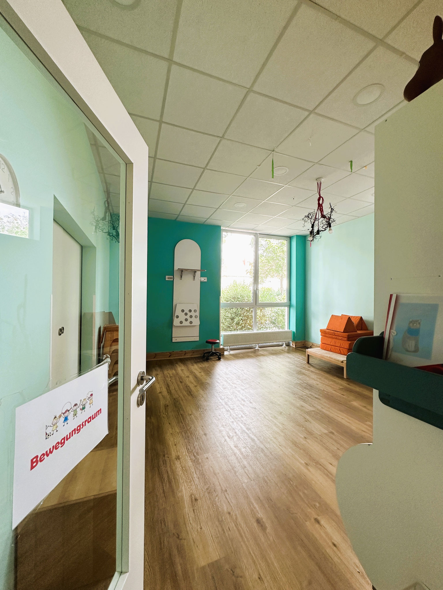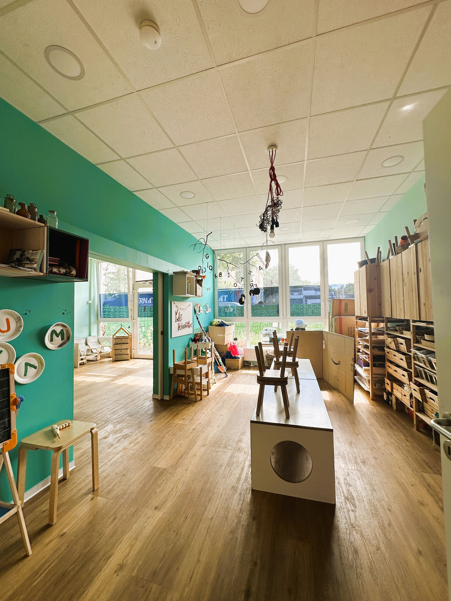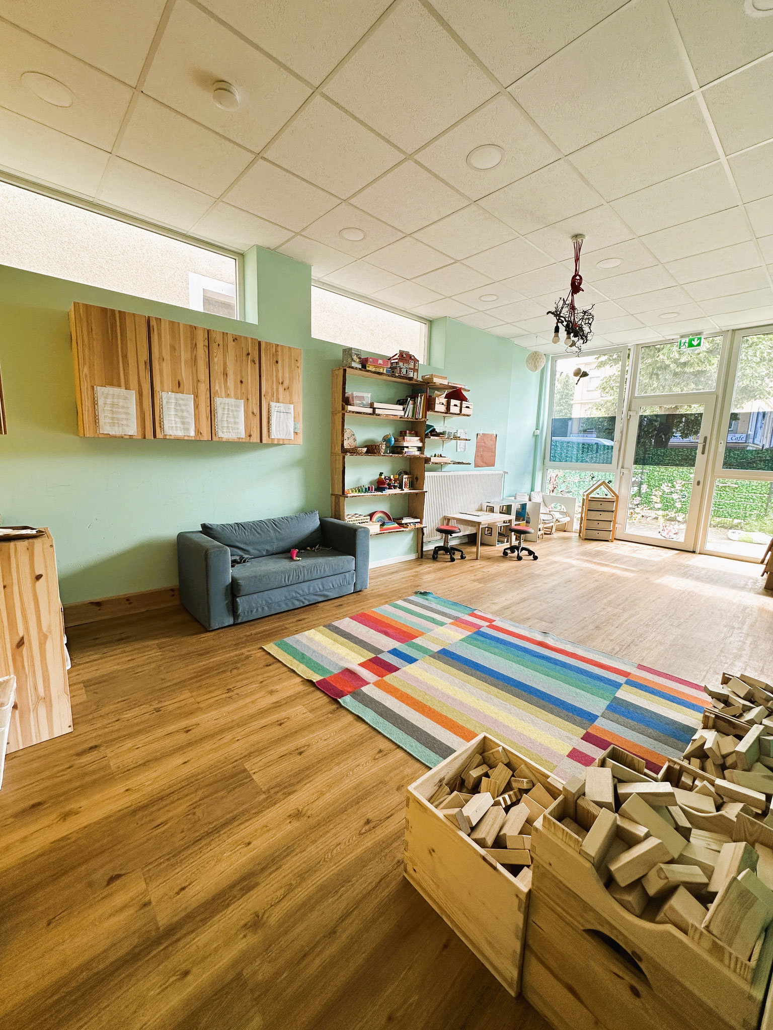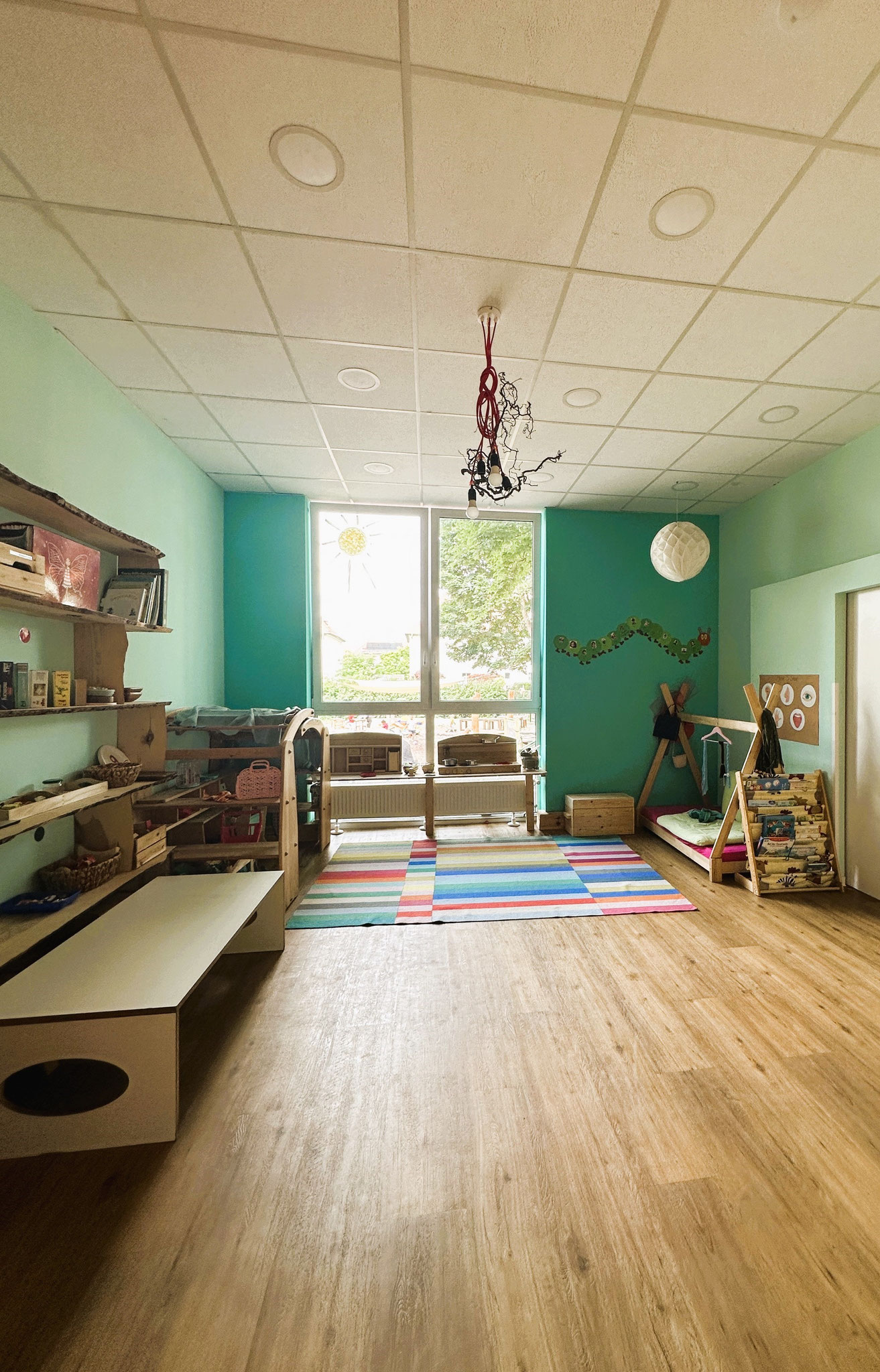 Mit einer Innenfläche von etwa 380 qm, einer geräumigen Außenfläche von etwa 450 qm, die sich in einen vorderen und hinteren Bereich verteilen, bieten wir auf insgesamt 830 qm Platz für 47 Kinder.